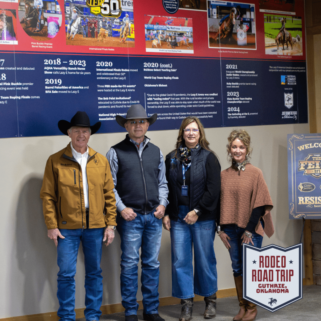 In conjunction with the BFI, the Lazy E celebrated the grand opening of the Equinety Center, a 30,000-square-foot multipurpose space designed to expand the future of equine excellence. The Cowboy Crew was privileged to play a small part in this development by creating the 36-foot timeline highlighting the Lazy E’s historic rise. Positioned at the intersection of the arena and the new center, it serves as a powerful reminder of where they began and where they are headed.