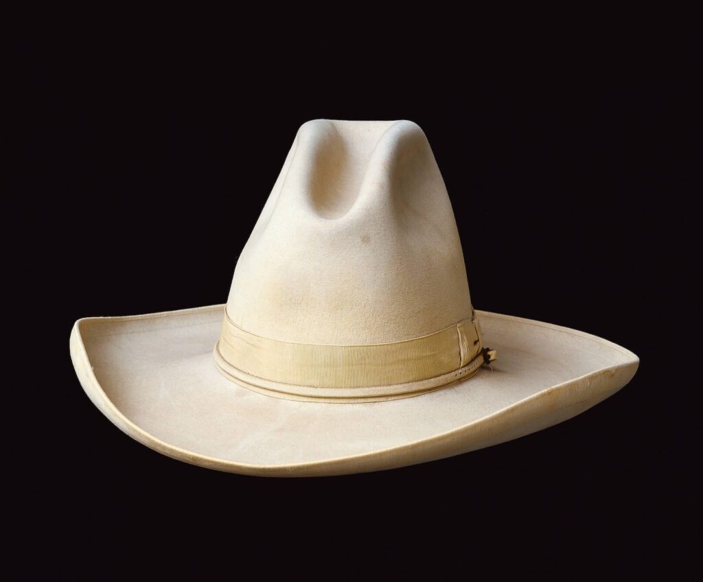 Mix wore a huge white ten-gallon Stetson, 7 inches high and 14 inches wide. At the height of his fame, Stetson was custom-making them for the movie star, the bigger the better. We even have one of the towering hats in our collection, created for the star in 1925.